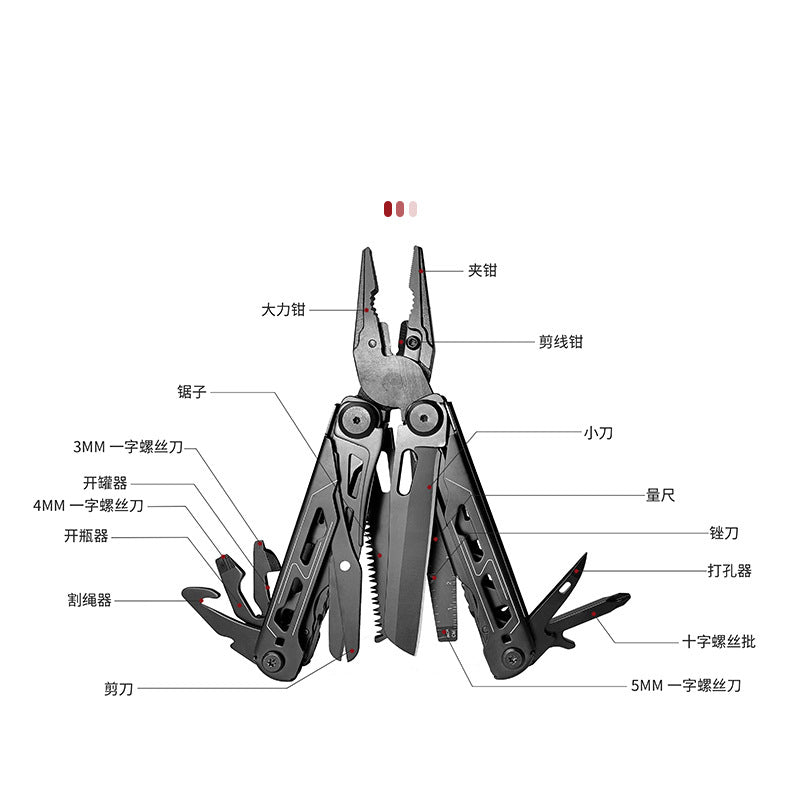 Dit multifunctionele hulpmiddel voor buiten is een must-have voor avonturiers. Het beschikt over 16 functies in één compact ontwerp, waaronder een tang (zowel gewone als sterke krachttypes), draadknippers, een zaag, verschillende schroevendraaiers (3 mm platte kop, 4 mm platte kop, 5 mm platte kop en kruiskop), een blikopener, een flesopener, een touwsnijder, een schaar, een klein mes, een liniaal, een vijl en een perforator.