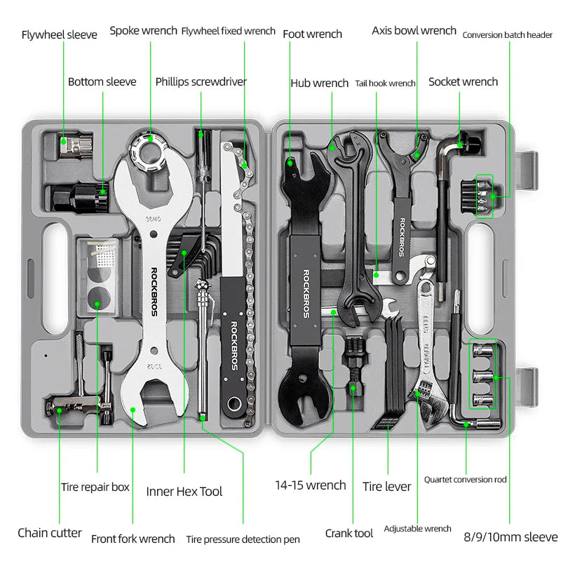 Complete Toolkit: Includes wrenches, chain tools, crank pullers, tire levers, and more for comprehensive maintenance