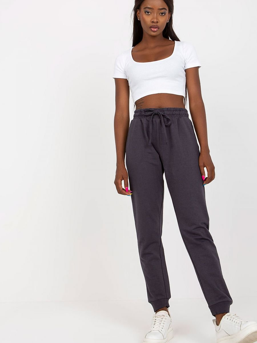 Sweatpants with elastic waistband, slip pockets on the sides. High-waisted pants with a tie at the waist.